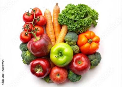 Vibrant arrangement of five colorful fruits and vegetables, including apples, carrots, tomatoes, and broccoli, forming the numeral five, promoting healthy eating habits.