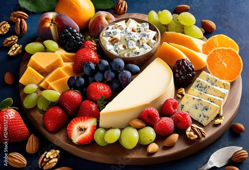 vibrant cheese board arrangement showcasing assorted colors textures accompaniments, fruit, nut, cracker, spread, gourmet, platter, charcuterie, sliced