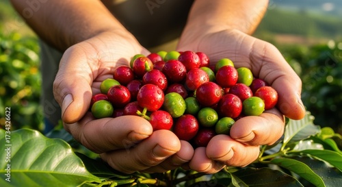 hot drink, cherry, harvest, agriculture, farming, hand, red, green, fresh, natural, organic, plantation, growing, bean, ripe, unripe, sustainable, environment, countryside