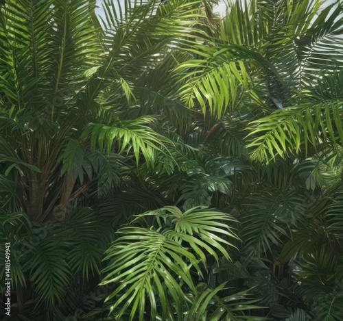Vibrant green palm leaves, sunlight dappled, lush texture , high resolution, macro