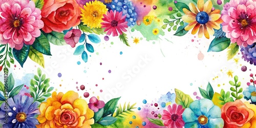 Vibrant hand-painted floral border adorned with watercolor splashes, perfect for text or banner card design, creating an artistic and colorful atmosphere for any occasion.