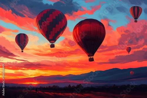 Vibrant hot air balloons ascend against a stunning sunset, with colorful clouds and mountains in the background, creating a serene and picturesque scene.