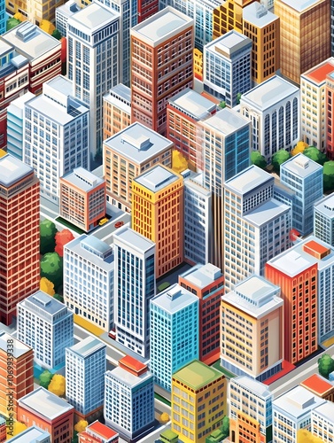 Vibrant Isometric City Skyline with Towering Skyscrapers and Residential Complexes