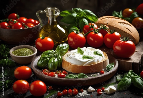 vibrant italian ingredients displayed textured background lush colors fresh produce, tomatoes, basil, garlic, olive, cheese, pasta, herbs, peppers