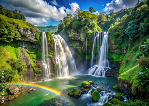 Vibrant Marokopa Falls rainbow arches over lush Waikato landscapes, New Zealand.