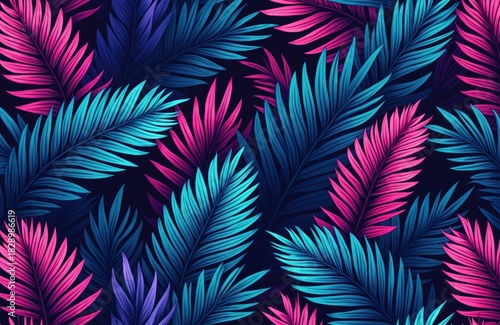 Vibrant neon palm leaves create seamless tropical pattern. Bright pink, blue, purple foliage on dark background. Modern abstract design perfect for trendy summer party visuals, adding stylish pop of
