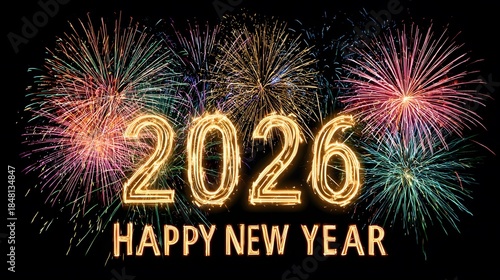 new year, 2026, fireworks, celebration, black background, festive, vibrant, colourful, explosion, party, holiday, greeting, card, design, luxury, shiny, bright, sparkling, illuminated, neon, light, display, event, countdown, midnight, cheer, joy, happiness, festive season, winter, night, dark, contrast, dramatic, elegant, sophisticated, glamourous, stylish, modern, contemporary, futuristic, dynamic, energetic, lively