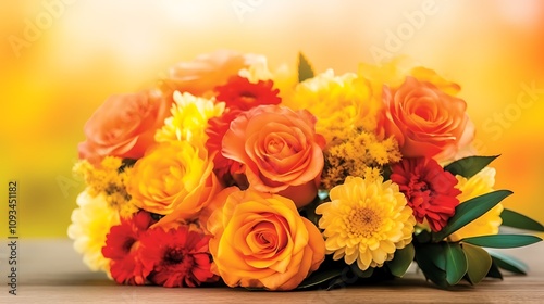 rose, yellow, orange, red, flower, bouquet, arrangement, floral, chrysanthemum, gerbera, flower petals, bloom, blossom, bud, stem, leaf, greenery, vibrant, colourful, bright, sunny, autumn, fall, wedding, romantic, love, beauty, nature, fresh, elegant, delightful, gorgeous, spectacular, decorative, display, table, wooden, background, closeup, image, photo, picture