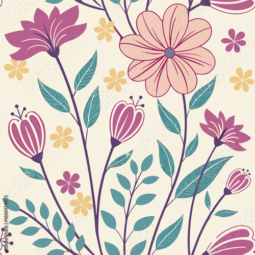 seamless, pattern, background, wallpaper, texture, fabric, textile, repeat, decorative, illustration, vector, graphic, design element, tiling, printing, vintage, retro, aesthetic, modern, stylised, continuous, abstract, floral, botanical, nature, flower, leaf, foliage, spring, summer, wildflower, vibrant, pink, purple, lilac, yellow, bright, lively, cheerful, elegant, detailed, stem, hand-drawn, full