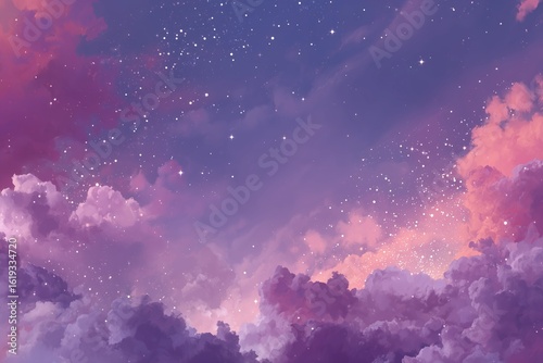 Vibrant purple and pink nebula cloud background filled with glowing stars, creating a dreamy and fantastical outer space sky scene with cosmic light, soft gradients, and a magical atmosphere