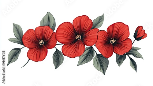 red, flower, leaf, bloom, floral, green, white, background, vibrant, delicate, flower petals, botanical, blossom, nature, beauty, spring, summer, garden, plant, art, illustration, design, graphic, pattern, aesthetic, elegant, natural, decoration, artwork, high-coloured, bright, style