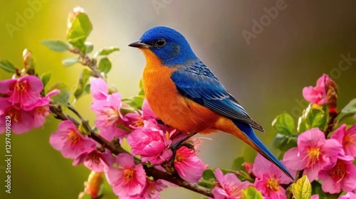 Vibrant Songbird Perched on Blooming Floral Branch in Natural Habitat Close up Detail of Colorful Bird with Bright Plumage Resting on Flowering Plant in Outdoor Garden or Forest Environment