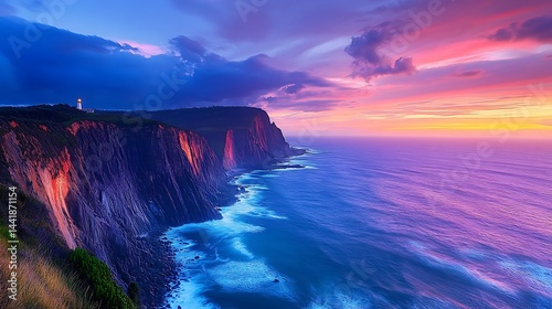 sunset, ocean, cliff, coast, lighthouse, landscape, seascape, twilight, sky, cloud, rock, wave, water, horizon, dramatic, vibrant, colours, purple, pink, blue, orange, evening, nature, scenic, view, beautiful, serene, calm, peaceful, tranquil, summer, travel, vacation, destination, photo, image, picture, photo
