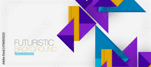Vibrant triangles and rectangles in shades of purple, violet, and magenta create a futuristic background on a white canvas, showcasing colorfulness and geometric shapes