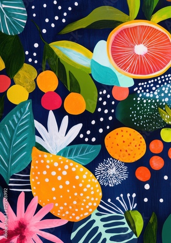 fruit, tropical, painting, abstract, colourful, leaf, floral, design, art, illustration, summer, bright, vibrant, orange, pink, green, blue, yellow, red, white, dot, pattern, texture, bold, modern, contemporary, stylish, creative, artistic, expressive, fantasy, imagination, nature, botanical, organic, juicy, fresh, citrous, grapefruit, mango, flower