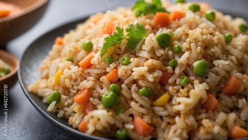 Vibrant vegetable fried rice with peas, carrots, and bell peppers, garnished with fresh cilantro, served in a black bowl, highlighting colorful and flavorful ingredients