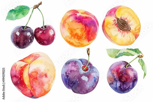 Vibrant watercolor illustrations of cherries, peaches, and plums, showcasing their natural beauty and rich colors.