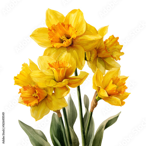 daffodil, daffodil, yellow flower, spring flower, bouquet, floral, bloom, blossom, bright yellow, golden yellow, green leaf, nature, spring, freshness, beauty, elegance, cheerful, joyful, vibrant, high-coloured, black background, isolated, closeup, detailed, painting, artwork, illustration, plant, flower petals, stem, floral arrangement, happy, sunny, optimistic, delicate