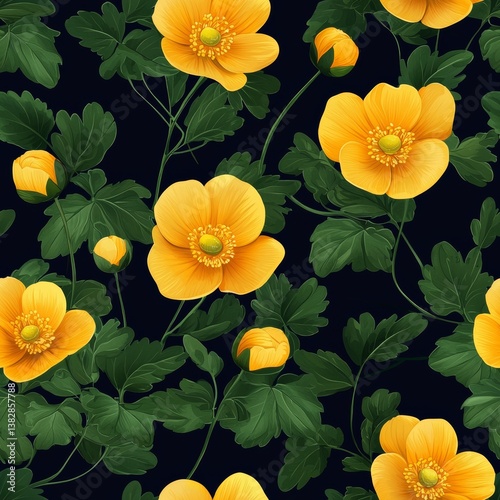 Vibrant Yellow Flowers with Green Leaves on a Dark Background Creating a Seamless Pattern