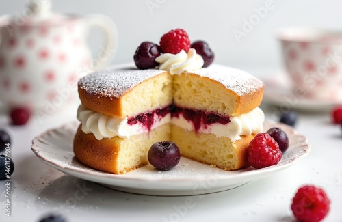 Victoria sponge cake with fresh raspberries and cherries on plate. Classic British dessert features fluffy sponge layers filled with jam and cream. Homemade dessert on white table. Food photography.