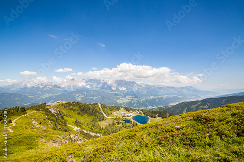 View from mountain Gasselhoehe to lake and distant mountain Dachstein