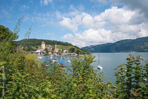 lake, switzerland, bernese, tour tourism, holiday maker, destination, vacation, village, hill, boat, harbor, resort, blue, summer, landscape, swiss, pictorial, colourful, water, cloud, sailboat, outdoors, white, green, brown, mountain, stunning, nature, history, historic, castle, house, landmark, nobody, view, lookout, scenery, scenic, sunshine, sunny