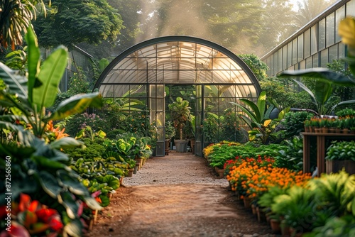 View of a geothermal-powered greenhouse, nurturing exotic plants with sustainable heating