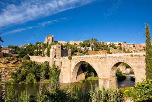 View of the San Martin Bridge crossing the Tagus to enter the old city of Toledo on the hill where you see the Old Cathedral