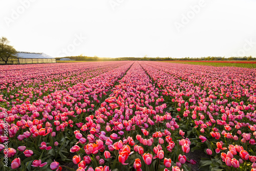 View over Pink Tulip Fields at Sunset in Spring, Ruigenhoek, South Holland, Netherlands