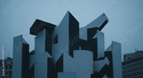 sculpture, shape, geometric, building, abstract, structure, urban, modern, architecture, art, exterior, contemporary, design, sky, grey, day, artistic, city landscape, artwork, historical building, view, construction, element, block, object, scene, metal, square, tall, place, creative, geometric shape, urban art, architectural, steel, white, black, minimal, low angle, minimalist, fine art
