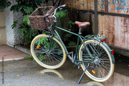 vintage green bicycle with basket reflected in rainy pavement