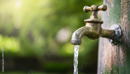 Vintage metal tap with running clear water in garden. Old faucet. Natural backdrop.