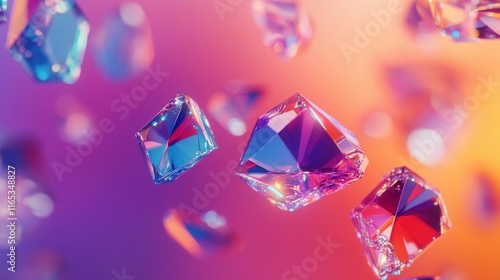 Vivid gem fragments glow on a coral-magenta backdrop with liquid effects