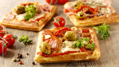 waffle, pizza, tomatoes, sauce, olive, ham, prosciutto, herb, cheese, baked, food, cookery, dinner, dining, snack, lunch, meal, diet, healthy, wood, background