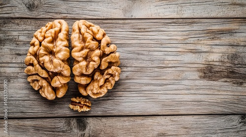 Walnut Halves Resembling Brain on Rustic Wooden Background Health Food Concept