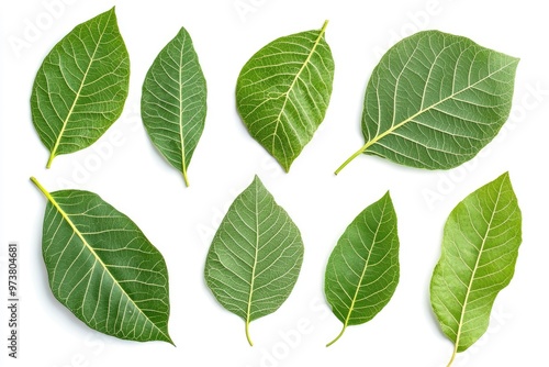 Walnut leaves collection. Leaves top view isolated. Green walnut leaf on white background. Flat lay leaf with clipping path. Full depth of field. Perfect not AI walnut leaf, true photo, ai