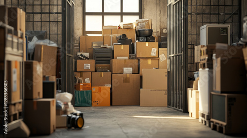 Warehouse interior with house stuff boxes. Vector cartoon illustration of open and closed storage facility gates, carton packages full of kitchen and living room things, stack of books, camera on wall