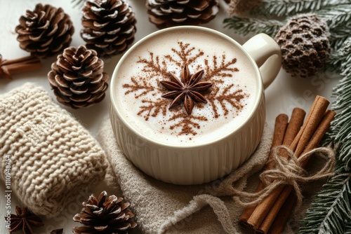 Warm beverage with winter spices and decorative toppings surrounded by pinecones and cinnamon sticks during a cozy holiday setting