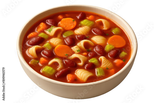 Warming bowl of pasta e fagioli soup in tomato broth with beans, carrots, celery, and shell pasta on transparent background