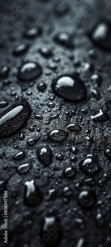 Water droplets fall on the black surface forming aesthetic bubbles