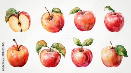 Watercolor Apple Showcase – A Lush Collection of Eight Detailed Illustrations Highlighting the Natural Beauty, Organic Textures, and Vibrant Colors of Freshly Harvested Frui