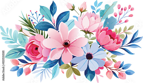 watercolor, bouquet, pink, blue, green, flower, delicate, leaf, stem, flocked, white, background, floral, arrangement, art, illustration, nature, beauty, bloom, design, romantic, elegant, soft, pastel, high-coloured, colourful, bright, summer, spring, garden, botanical, pattern, texture, abstract, artistic, creative, inspiration, gift, celebration, wedding, love, joy, feminine, fresh, fragrance