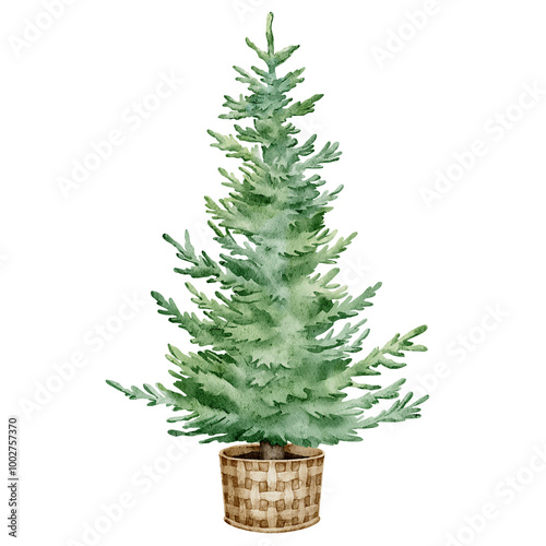 Watercolor Christmas Tree in a wicker basket. Hand drawn Illustration for Holiday Greeting Cards and New Year Invitations on isolated background. Drawing of evergreen Fir tree for Xmas design.
