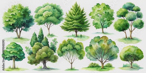 Watercolor Collection of Diverse Green Trees, Watercolor, Watercolor Painting, Trees, Nature, Illustration