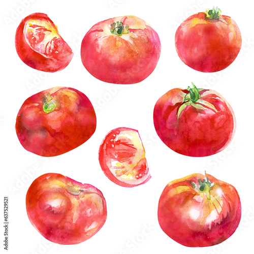 Watercolor drawing of red, ripe tomatoes. Fresh tomato vegetables. Round nightshade fruits. Naturalistic drawing. Delicious tomatoes. Tomatoes cooked for salad.