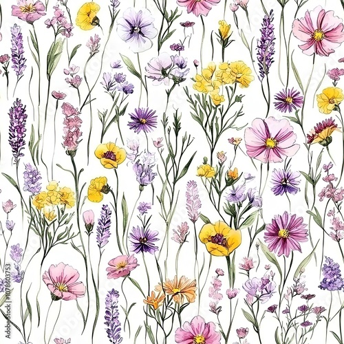 Watercolor Floral Flowers Wildflowers Garden Seamless Pattern Texture, Cute Botanical Summer Meadow Print