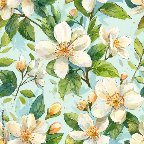 seamless, pattern, floral, watercolor, flower, white, green, leaf, design, spring, summer, blossom, tree branch, botanical, natural, elegant, decorative, texture, background, wrapping, surface, textile, artistic, vintage, romantic, illustration, wallpaper, drawing, painted, aquarelle, flowering, blooming, nature, flora, plant, beauty, delicate, light, pastel, fresh, pretty