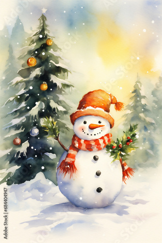 watercolor, painting, christmas, christmas, snowman, snowman, generative, ai, snow, man, illustration, greeting, hat, cartoon, merry, new year, present, snowflake, december, art, fun, happy, vintage, holly, drawing, white, clip art, fairy tale, eve, festive, ball, drawn, smiling, carrot, children, happy new year, celebrate, joy, children, ornament, picture, snowing, retro
