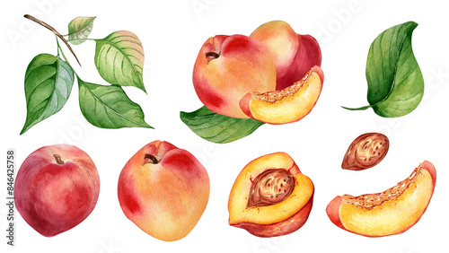 Watercolor set of fresh various peaches and tree branch isolated on white. Hand drawn fruit and leaves illustration. Whole and sliced peaches painted. Design element for package, label and other