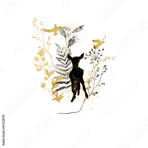 Watercolor woodland night landscape. Hand painted abstract, deer, fawn, birds, gold leaves, greenery, wildflowers, herbs, fern. isolated on white background. illustration for design, print background